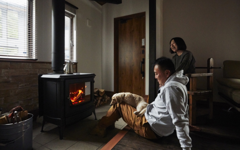 あえてソファは置かず大テーブルでゆったりと。Kさんの希望で冬の主暖房は薪ストーブに