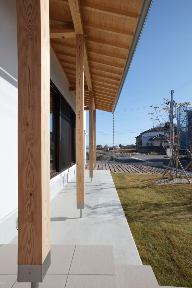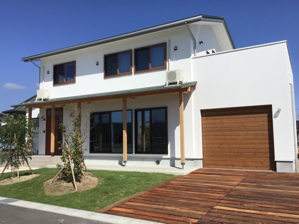 青空に映える眩しい白壁と大きな庇屋根が印象的な住まい。自然エネルギーを取り入れて年中快適に暮らせる、住む人と住まいの健康を考えた「エアサイクルの家」です。外張り断熱を採用し、床下、壁の中、屋根裏に空気を循環させ、建物の温度や湿気を調整するエアサイクルの家。夏は床下と屋根裏に換気口を開けることで、煙突効果により熱気を逃がし、冬は閉じることで冷たい外気の侵入を防ぐため、最小限の冷暖房で年中快適な温度を保ちます。宮城県産材をはじめ自然素材をふんだんに使用した省エネ住宅を多く手掛ける弊社ならではのモデルハウスは、冬も春の陽だまりのような暖かさが体感できるとともに心地よいオープンな空間に満ちた無垢材の優しいぬくもりと清々しい香りに心が解き放されます。壁はほたて漆喰の塗り壁を採用し、浴室は壁と天井にヒノキを使うなど、隅々まで使われた自然素材が心を癒します。雨の日も車を降りて濡れずに家に入れる電動シャッター付きのガレージ、アウトドアリビングとして使える屋上も備えた、遊び心もプラスした住まいです。