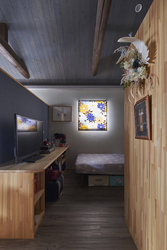 玄関から進むと、勾配天井に現しの梁が印象的なリビング・ダイニングが広がります。その周りに使い勝手の良い回遊式のオープンキッチン、扉を設けず段差でゾーニングした寝室を配置。寝室からトイレ・浴室への動線を直線で結び、暮らしやすさを実現しています。